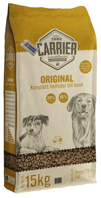 Carrier orginal är ett helfoder till vuxna och unghundar av alla raser med normal till låg aktivitetsnivå (dagliga promenader). Carrier Original är tillverkat av högkvalitativa råvaror för högsta smältbarhet och smaklighet.